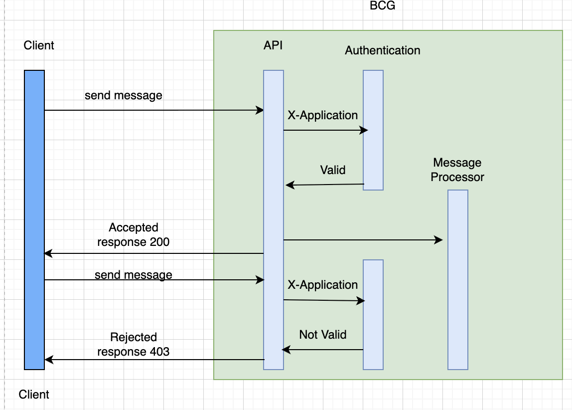 BCG dispatches customer messages on-site. There is no authentication/authorisation, so any caller can invoke